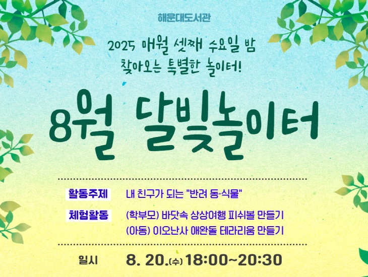 부산시립해운대도서관이 오는 20일 오후 6시부터 8시 30분까지 '8월 달빛놀이터'를 운영한다. 이번 달빛놀이터는 단순히 책을 읽는 것을 넘어, 독서와 연계된 다양한 체험 활동을 제공한다.