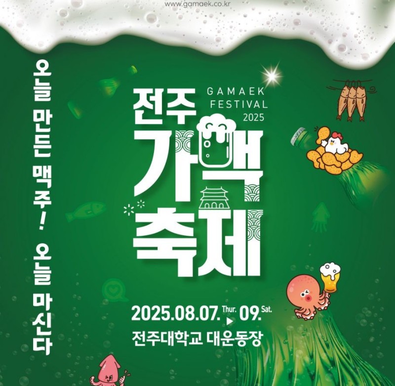 전주의 대표적인 여름축제인 ‘2025 전주가맥축제’가 펼쳐진다. 전주가맥축제추진위원회(위원장 이성일)가 주관하는 ‘전주가맥축제’가 오는 7일부터 9일까지 3일간 전주대학교 대운동장에서 개최된다.