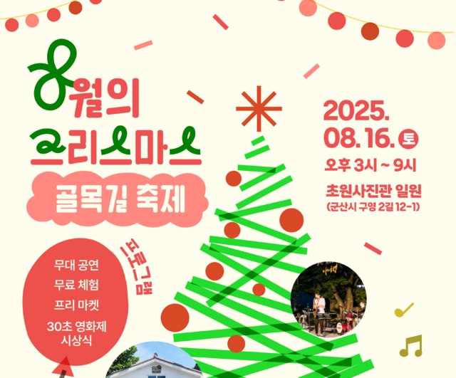 군산시가 영화 ‘8월의 크리스마스’ 촬영지로 유명한 초원사진관 일대에서 오는 16일 ‘8월의 크리스마스 골목길 축제’를 개최한다. 축제는 축하 공연을 시작으로 추억의 오락실, 레트로 감성의 프리마켓, 30초 단편 영화제 시상식, 흑백사진 셀프 사진관 등 관람객이 직접 즐기고 체험할 수 있는 다채로운 프로그램으로 구성된다.